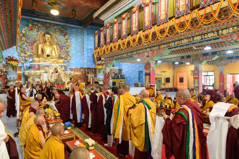3. His Eminence Gyaltsab Rinpoche, Zurmang Gharwang Rinpoche, Yongey Mingyur Rinpoche, Khenpo Lodro Donyo Rinpoche, and the retreat master of the Ralang three year retreat center were present to offer Bokar Yangsi Rinpoche his ordination vows. The beautiful pale yellow silk robes which Bokar Yangsi Rinpoche offered to the Buddha statue are being placed on the statue by the monk in charge.