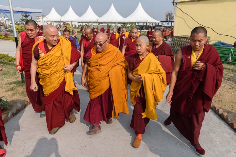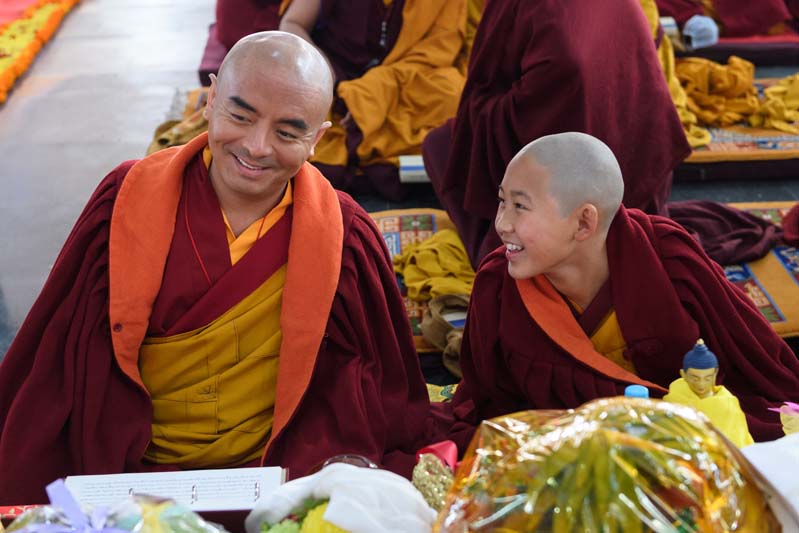 6. The rinpoches arrive back at the Monlam Pavillion and took their seats on the front row of the sangha. Yongey Mingyur Rinpoche and Bokar Yangsi Rinpoche share a joke.