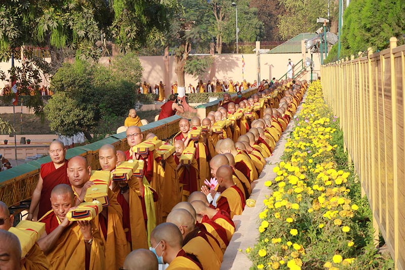 On a cloudless morning, the sun only half an hour above the horizon, a line of red and gold snaked slowly through a green rice field in Bodhgaya. Those chosen to carry the volumes of the Kangyur, the words of the Buddha, in circumambulation around the Mahabodhi Temple were on their way from the Monlam Pavilion, their neatly folded chogus (the outer yellow robes worn for important rituals) on their shoulders. By 6:30 a.m., they had already taken sojong vows, chanted the Sanskrit prayers of refuge in the Three Jewels, and eaten a quick breakfast of butter tea and bread in the pavilion. This full moon day, Chötrül Düchen — one of the four holiest days in the Tibetan calendar — commemorates the Buddha’s first teaching to five friends in Sarnath shortly after his enlightenment. This year, it fell on the Indian festival of Holi, and the taxis and tuk-tuks were in short supply, so everyone walked.
