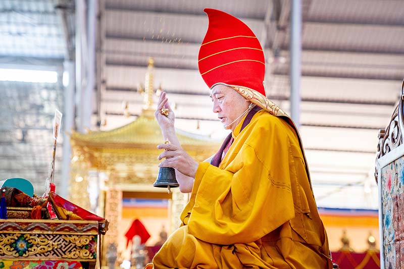 His Eminence the Goshir Gyaltsapa bestowed the Torma Empowerment of Gyalwa Gyatso to an assembly of international Sangha and Himalayan laypeople, who filled the massive vaulted pavilion to overflowing, spreading outside like a river to the pop-up stalls and hubbub of Indian street life.