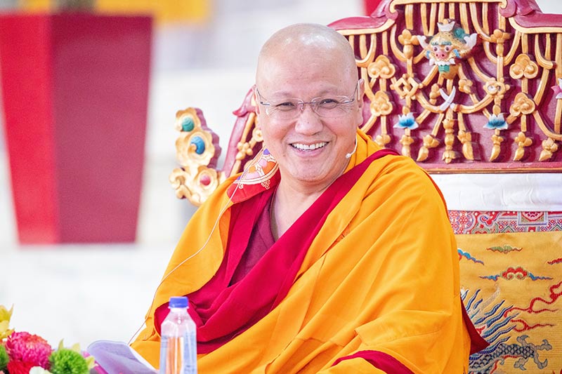 Reminding everyone to hold bodhichitta in their hearts, Kyabje Drubwang Sangye Nyenpa Rinpoche began his third and last day of teaching Tilopa’s Ganges Mahamudra, the upadesha or key instructions for the practice of mahamudra. At the start of his talk, Nyenpa Rinpoche reviewed the previous verses and added new commentary. He explained that highly developed adepts could realize the whole text by simply hearing the title. Summarizing the text’s meaning at the next level comes in the traditional prostration of the translator: