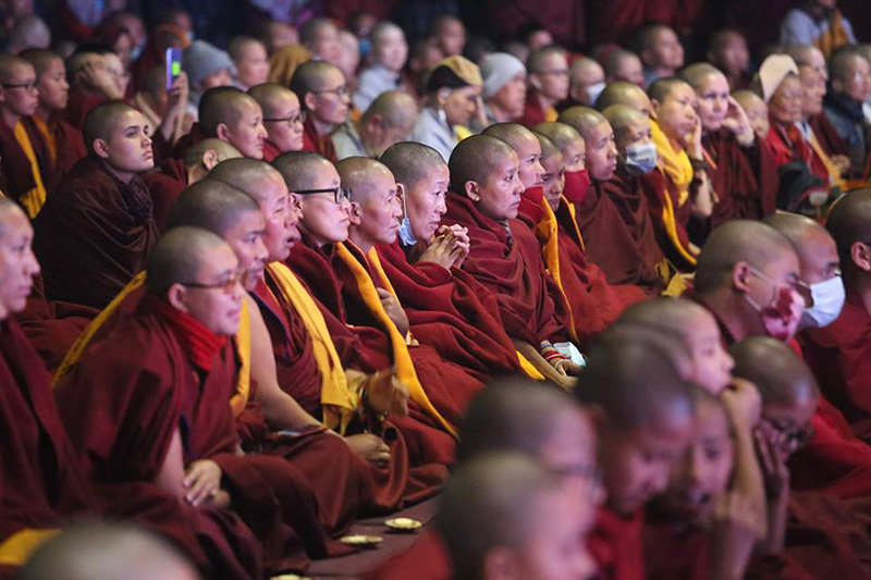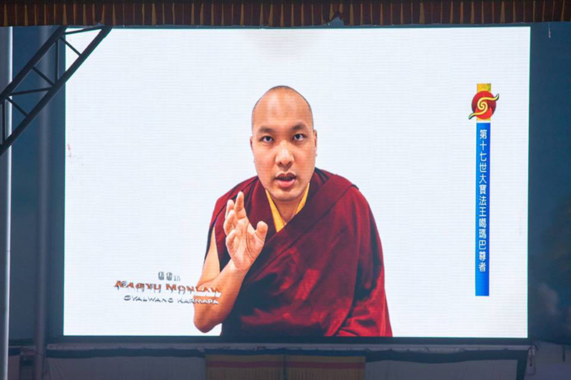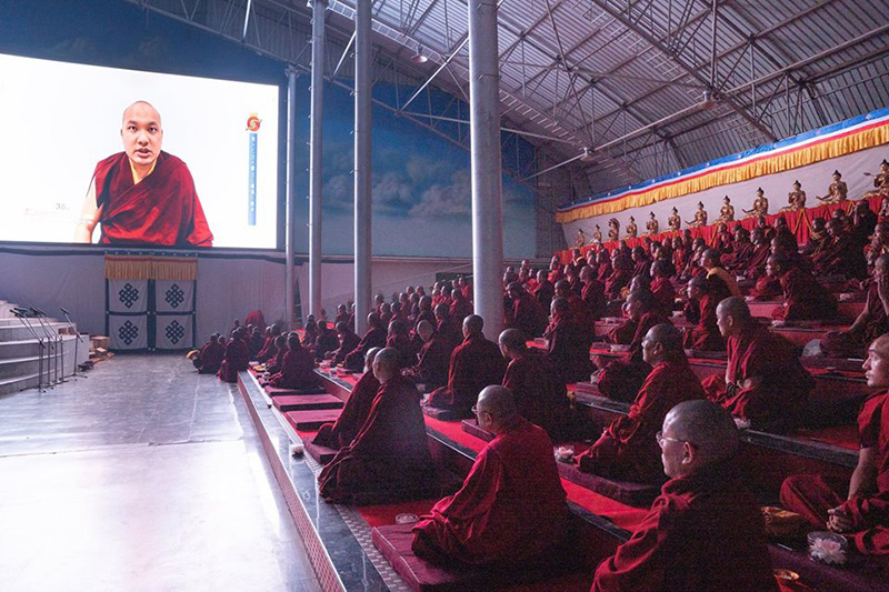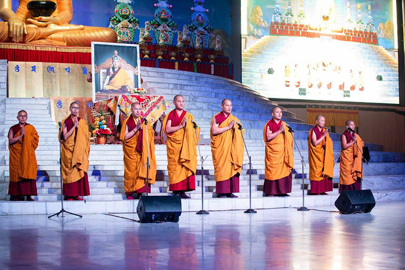 ༡༡༽ སྒྲུབ་སྡེ་ཆོས་ཀྱི་དཔལ་མོའི་ལྡིང་ཁང་གི་བཙུན་མ་རྣམས་དང་ཁྲ་འགུ་བཛྲ་བི་དྱཱའི་གཙུག་ལག་སློབ་གཉེར་ཁང་གི་དགེ་འདུན་ཐུན་མོང་ ནས་དཔལ་༸རྒྱལ་དབང་ཀརྨ་པ་མཆོག་ནས་མཛད་པའི་རབ་དགའི་སྨོན་ལམ་གྱི་སྨོན་ཚིག་དེ་བཞིན་སྙན་འཇེབས་ལྡན་པའི་དབྱངས་ཀྱི་སྒོ་ནས་ འདུས་པ་ཡོངས་ལ་གཟིགས་འབུལ་ཞུ་བཞིན་པ།
