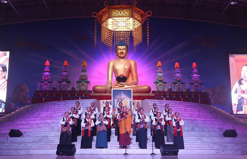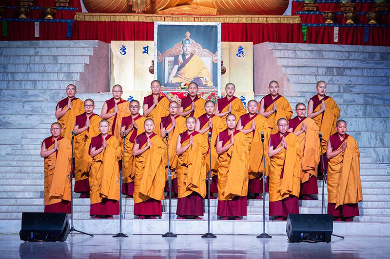 ༩༽ འབྲུག་ཡུལ་ནས་ཡིན་པའི་སྒྲུབ་སྡེ་དཔལ་མོ་ཆོས་ཀྱི་ལྡིང་ཁང་གི་བཙུན་མ་རྣམས་ནས་དཀོན་མཆོག་གསུམ་གྱི་བསྟོད་དབྱངས་ཞེས་ པ་དབྱངས་རྟ་སྙན་པོའི་སྒོ་ནས་ཚོགས་ཞུགས་པ་ཀུན་ལ་གཟིགས་འབུལ་བསྟར་བཞིན་པ།