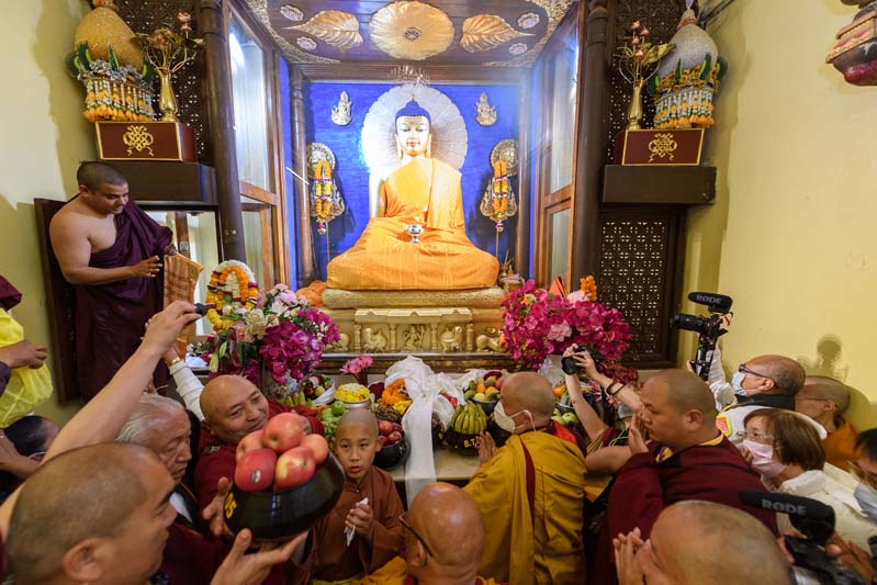 5:00,安檢門燈亮起,大家快動作接受安檢,迅速進入正覺大塔。5:10,波卡轉世仁波切暨國師嘉察仁波切、蘇曼噶旺仁波切、詠給明就仁波切、堪布羅卓東由仁波切,及大吉祥寺閉關導師圖滇天津久美等五位具戒比丘,一起進入人潮擠得水洩不通的正殿,供缽、供花、供佛衣。在儀式正式開始之前,先向佛陀聖像禮敬暨作廣大獻供,代表向佛法僧三寶的源頭致敬,並為圓滿儀式創造吉祥緣起。
