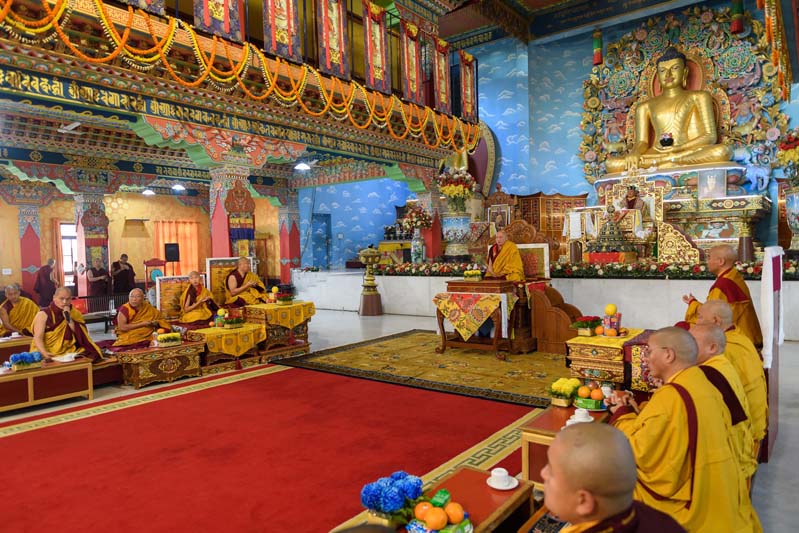 儀典主法上師是國師嘉察仁波切,主法上師右側法座,前方是明就仁波切,後方是大吉祥寺閉關導師圖滇天津久美;左側緊隨嘉察仁波切法座之側,是堪布羅卓東由仁波切,接著是蘇曼噶旺仁波切,五位具足比丘戒的大德,安坐在正前及左右兩側。波卡轉世仁波切則在祈願法會總維那師隨侍下,靜立在國師嘉察仁波切法座正前方。